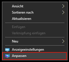 In Windows 10 klicken Sie auf den Desktop mit der rechten Maustaste und wählen in dem Kontextmenü den Eintrag "Anpassen" (Siehe Screenshot).
